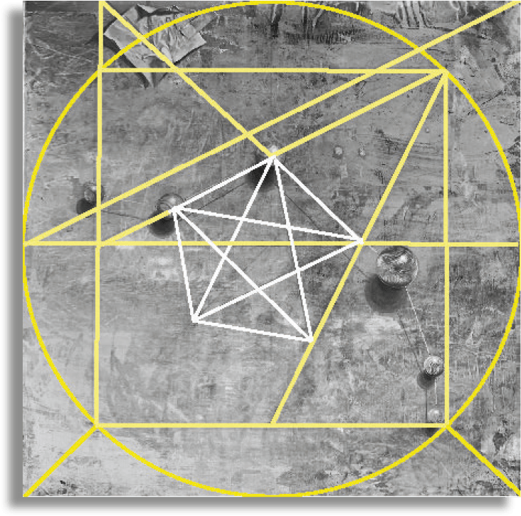 BELIER 80 x 80 cm, acrylique sur toile Construction du tableau avec le nombre d’or : Voir les autres signes : ◁ retour 1,618 : GALERIE DES DOUZE SIGNES DU ZODIAQUE